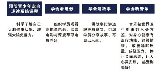 1.线上线下青少年心理健康课程 2.行为养成训练 3.社会实践活动